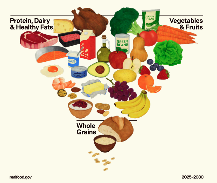Overemphasis on animal protein/full-fat dairy — The inverted pyramid places meat, eggs, full-fat dairy, and proteins prominently at the top (broadest section), with whole grains smaller at the base. Critics argue this downplays plant-based proteins and deviates from the independent 2025 Advisory Committee's evidence-based report (which was largely sidelined).